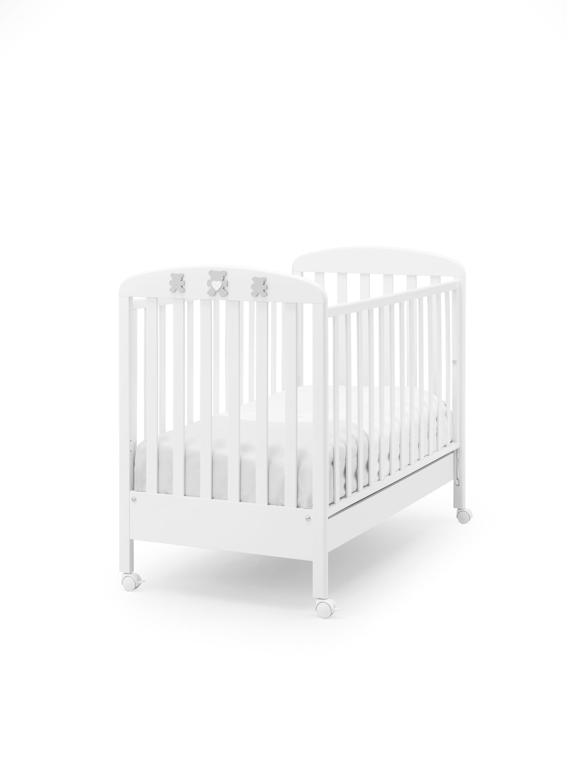 Postýlka Molly s medvídkem a srdíčkem. Postýlka disponuje polohovatelným roštem a jednoduše stahovatelnými bočnicemi – manipulaci snadno zvládnete i jednou rukou.
